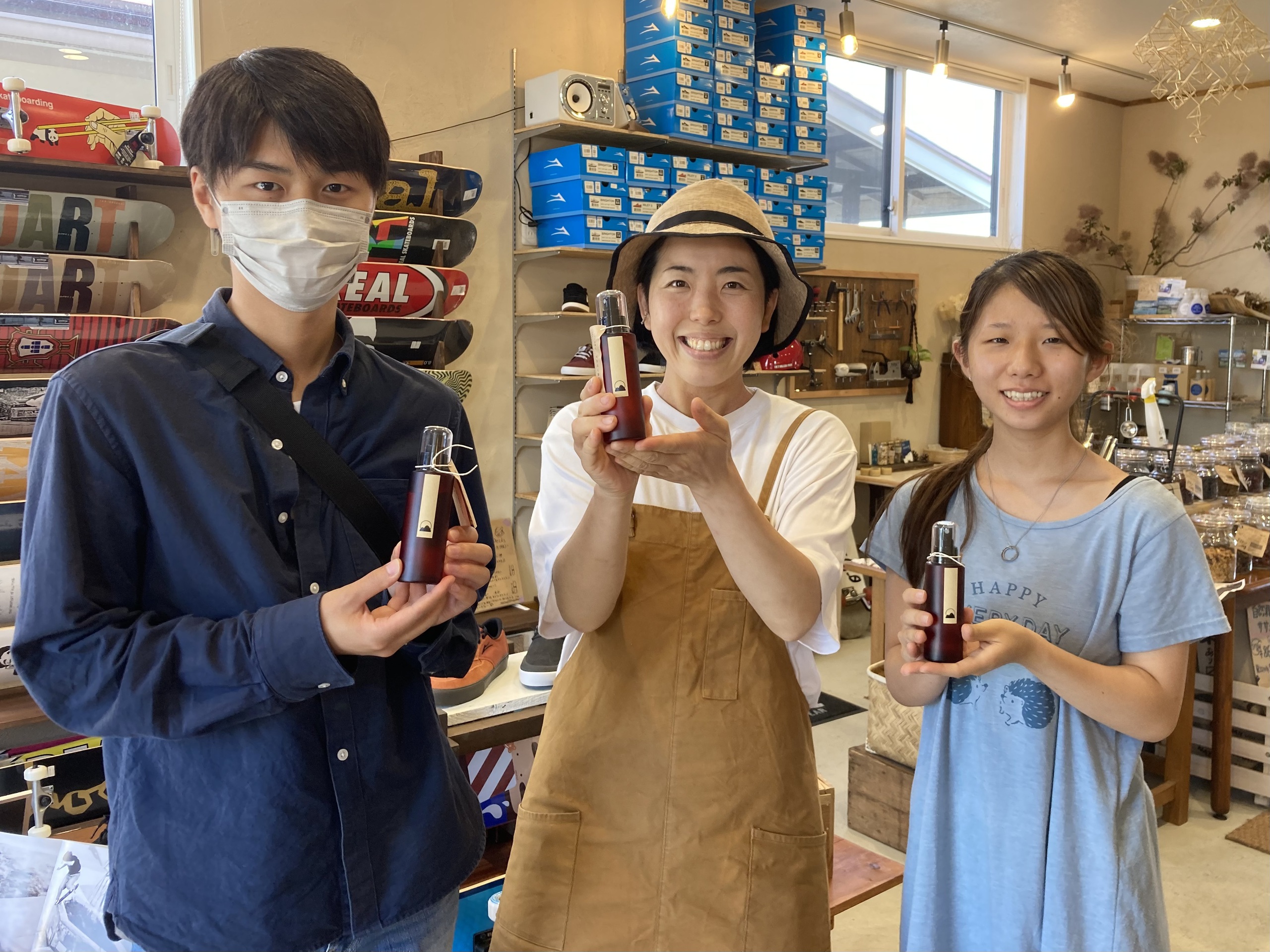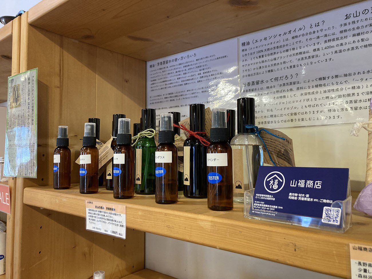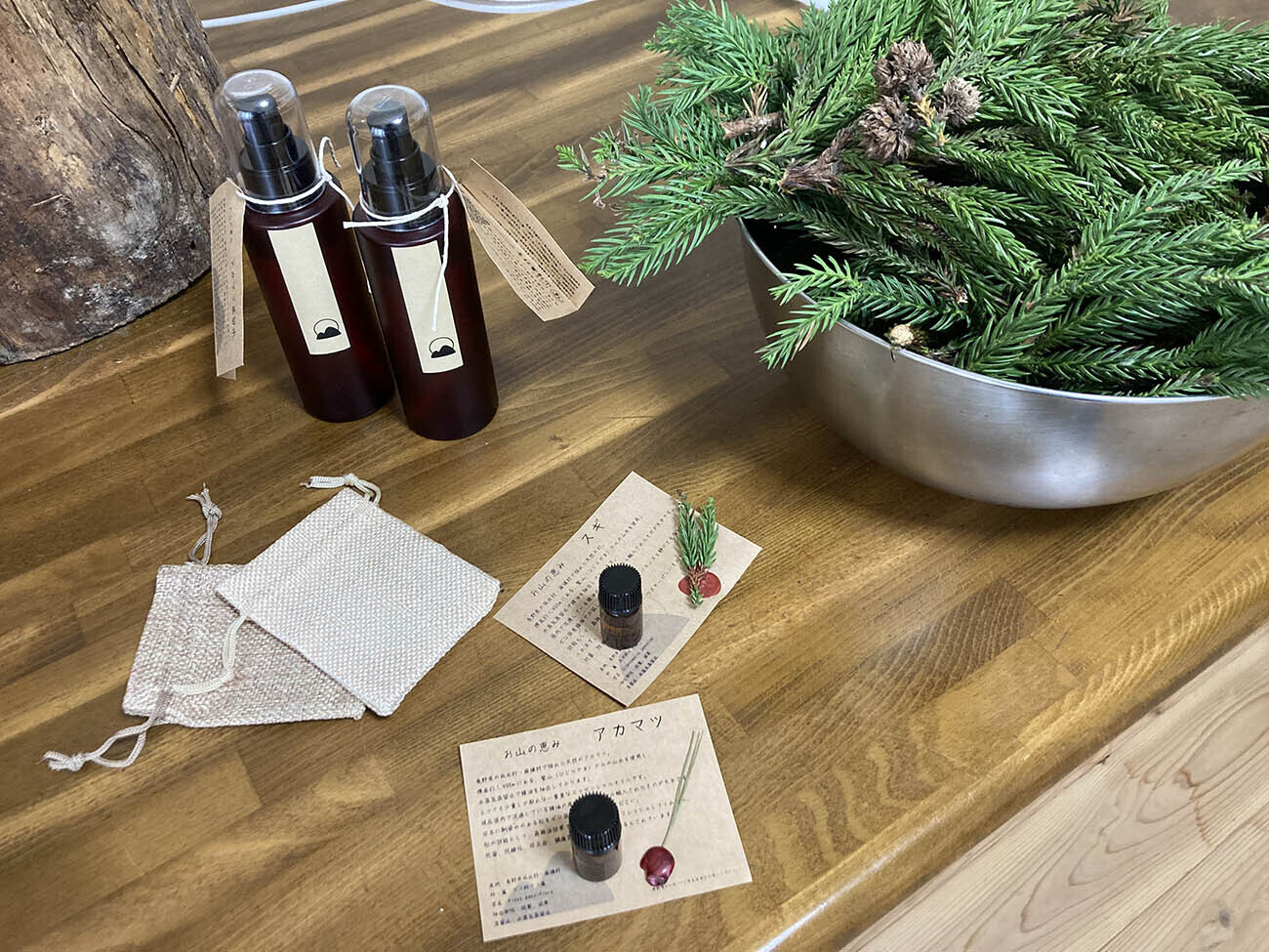 村の特産品であるアカマツをはじめ、スギやヒノキを中心に国産精油、芳香蒸留水を製造、販売しています。間伐や枝下ろしの際に出る枝葉を有効活用しました。植物自身が自分たちを守るために蓄えている天然の芳香成分には、植物の生命力が凝縮されており、とても貴重な自然界からの贈り物です。標高1400mの高さにある聖山(ひじりやま)から湧き出る天然水を用い、「水蒸気蒸留法」という高温の水蒸気で植物の成分を抽出する方法により、一滴一滴、丁寧に精製しています。